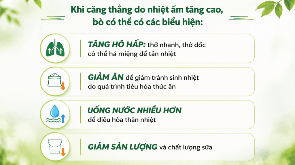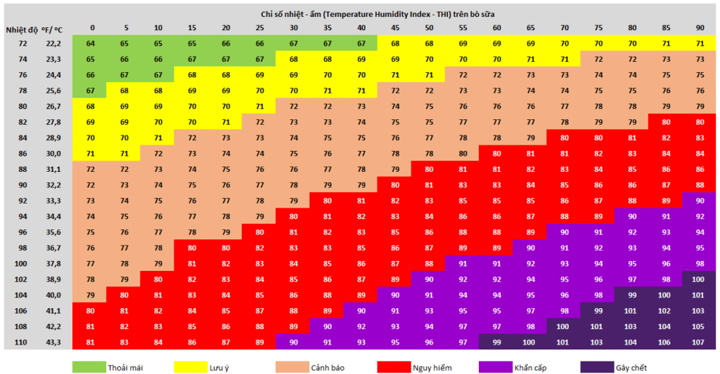 Độ ẩm không khí trung bình tại Việt Nam khoảng 70 – 80%, do đó nhiệt độ cảm nhận của bò sữa thường xuyên nằm trong vùng “Cảnh báo”. Độ ẩm càng cao thì khả năng thải nhiệt trên vật nuôi càng khó khăn